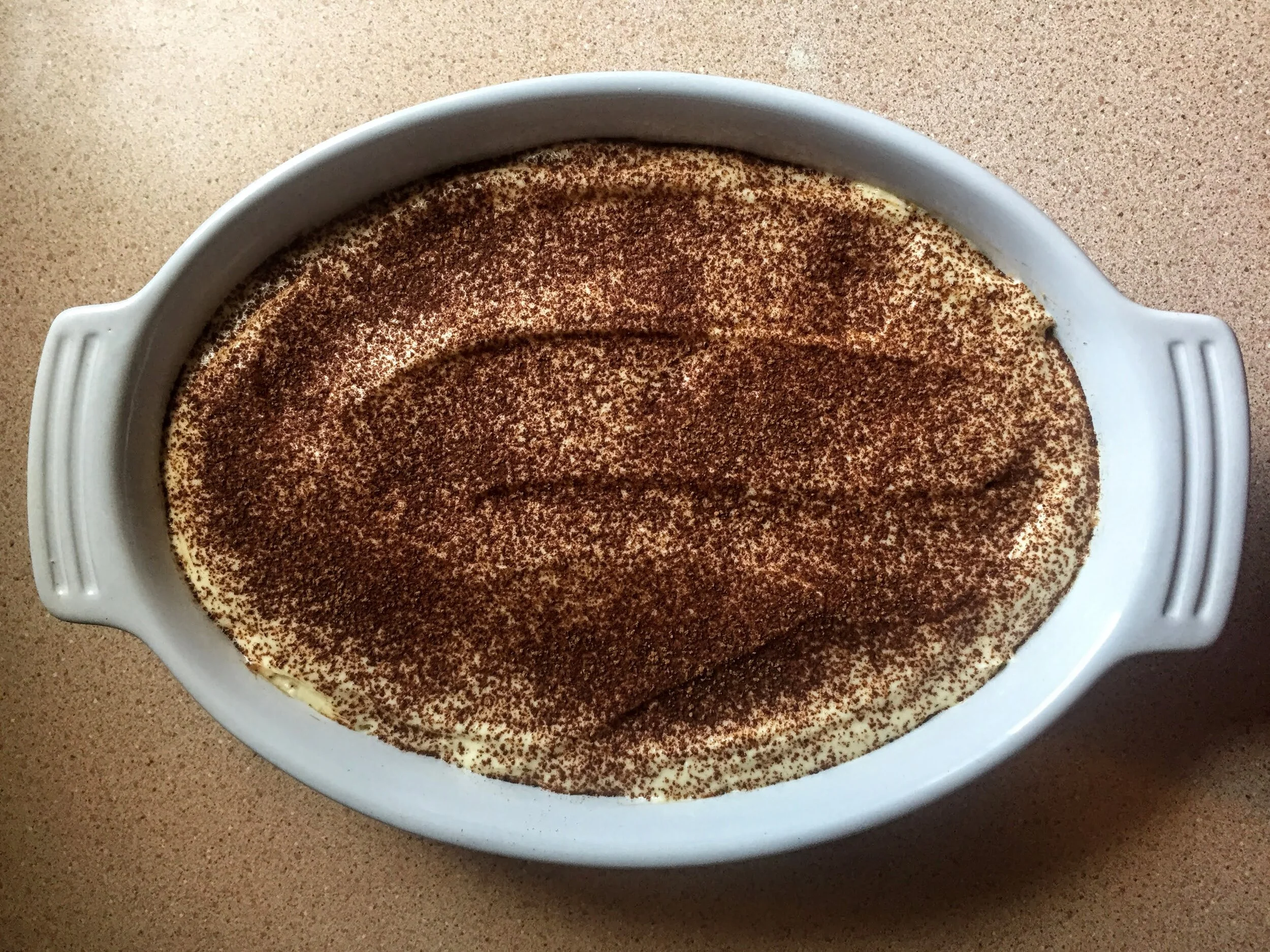 I used a Le Creuset oval dish for my tiramisu, but whatever shallow serving dish you’d like to use is fine. I traced the outline of my dish onto the sponge cake and cut two layers out. Scraps can be snacked on.